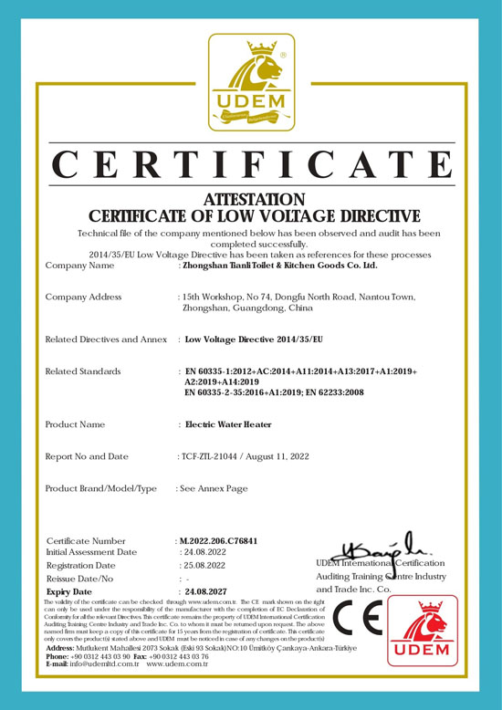近日,天立公司即熱式電熱水器產品更是通過歐盟權威認證機構審核,并獲得CE認證證書。